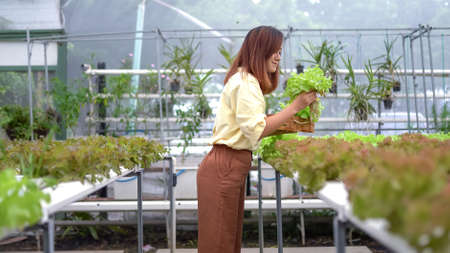 Portrait of asian woman harvesting fresh vegetables in hydro farm