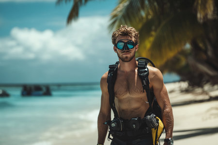 A pair of scuba diving goggles lay on the sandy beach, with azure waters and blue skies creating a picturesque natural landscape. Vision care eyewear for underwater adventures AIG50