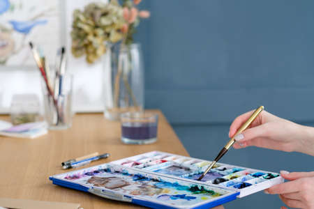 Set of watercolor paints and paintbrushes for painting close up. Selective focus.