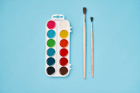 Watercolor paints and brushes, top view. Hobbies and creativity. white background. Set of colorful paints palette