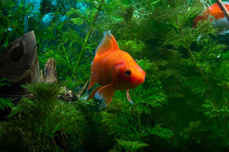 Beautiful goldfish swims among algae in the aquarium. Aquarium fish close-up.