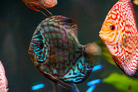 Colorful fish from the spieces Symphysodon discus in aquarium. Closeup, selective focus.