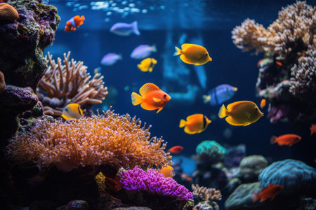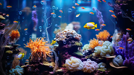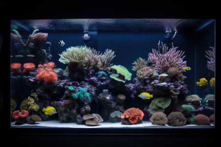 close-up of fish swimming among coral reefs in living room aquarium, created with generative ai