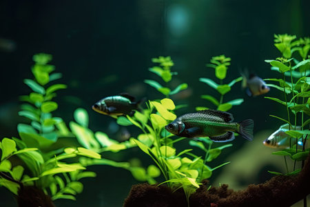 macro view of green plants in aquarium with colorful fish, created with generative ai