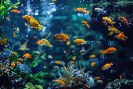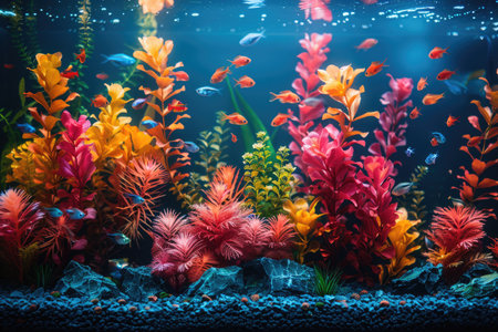 aquarium with schools of colorful fish swimming among underwater plants, created with generative ai