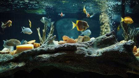A captivating aquarium scene showcasing various colorful fish swimming gracefully among driftwood and rocks, highlighting the beauty of aquatic life.