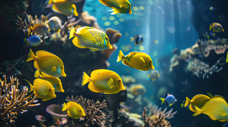An enchanting underwater scene showcasing vibrant tropical fish and colorful coral reefs in crystal clear water. Ideal for nature lovers and aquatic enthusiasts.