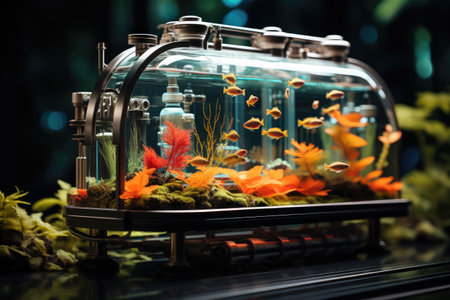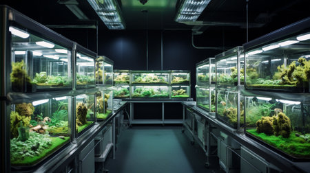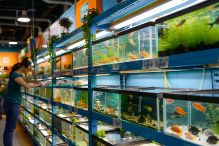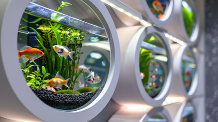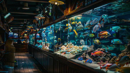 Vibrant aquariums that are beautifully filled with a variety of exotic fish and lush aquatic plants in a retail store. Generative AI