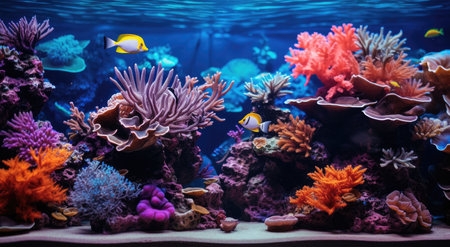 This stunning aquarium display showcases colorful tropical fish gracefully swimming among vibrant coral and marine decor. Ideal for nature lovers.