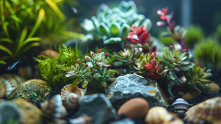 A terrarium aquarium hybrid with a variety of underwater plants and small fish swimming amidst decorative stones and shells