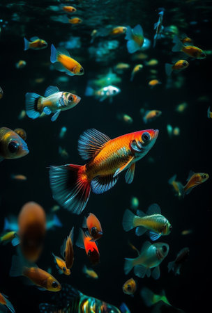 Captured Underwater View of Colorful Fish Swimming Gracefully in a Beautiful Blue Aquarium