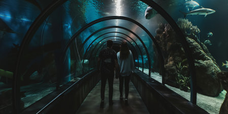 Couple Walking Through Underwater Tunnel in Aquarium with Sharks and Marine Life.
