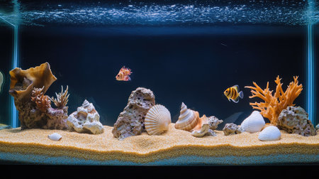 A luxurious aquarium with golden sand, crystal-clear water, and exotic shells placed elegantly at the bottom.