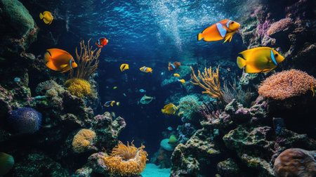 An aquarium scene with diverse colorful fishes swimming amongst the coral formations and aquatic life.