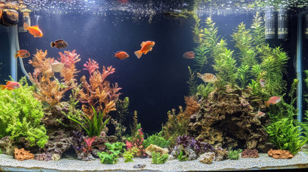 A freshwater aquarium with colorful fish swimming among rocks and plants