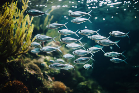 Silver fish swimming together in an aquarium, creating mesmerizing wave patterns that enhance the tranquil underwater environment
