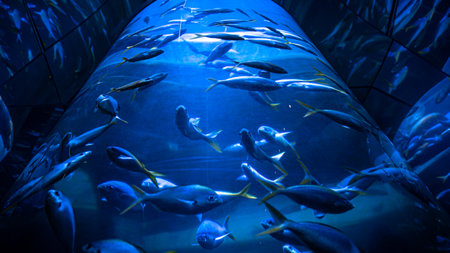 In the deep blue glow of a massive circular tank, a mesmerizing school of fish swims in a perfectly synchronized, swirling vortex. Their collective movement creates a living, breathing spectacle of unity, flow, and the mysterious beauty of marine life.