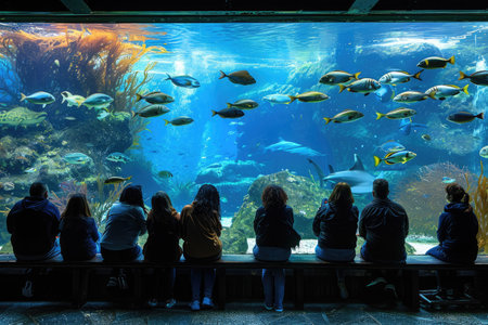 A diverse group of enthusiastic people marveling at various fish swimming around in a beautifully designed aquarium filled with water