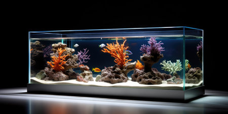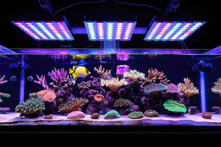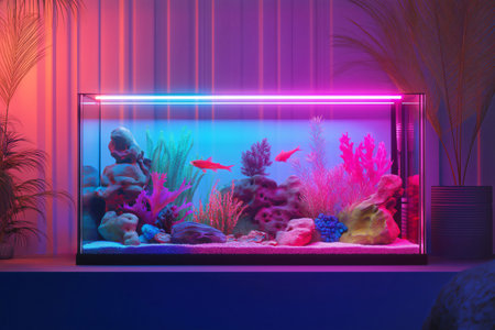 Mesmerizing fish tank with colorful led lights illuminating vibrant coral, rocks, and fish, creating a captivating underwater scene