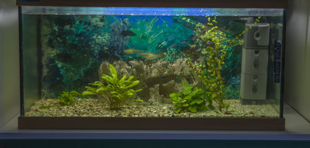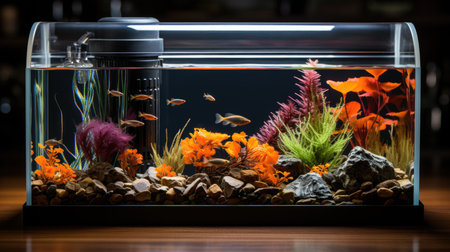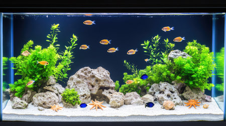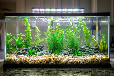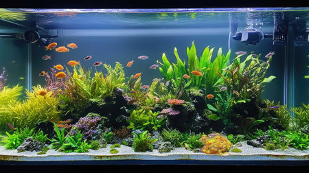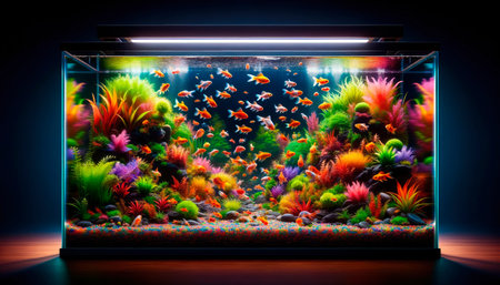 A well-maintained freshwater aquarium, brightly illuminated, showcasing a variety of aquatic plants and small, vibrant fish swimming gracefully.