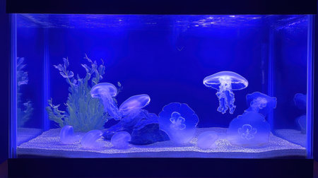 Discover a tranquil underwater scene featuring graceful jellyfish gliding through a vibrant blue aquarium. Soft lighting and aquatic plants create a serene environment.