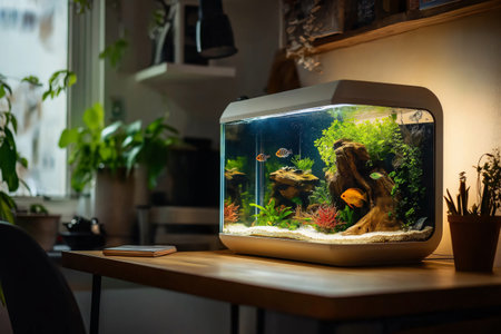An aquarium filled with various fish species is the central focus in a well-lit indoor environment. The fish display a range of bright colors, contrasting with the dark background. The scene includes a side table with a lamp, highlighting potential uses for home decor or educational materials.