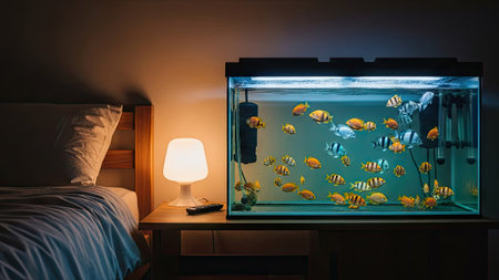 A well-lit aquarium featuring numerous colorful tropical fish sits adjacent to a bed with a bedside lamp. The scene is illuminated by the aquarium lights and lamp, creating a soft glow. The interior setting suggests a bedroom, providing a tranquil and cozy environment, suitable for various editorial and commercial projects.