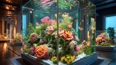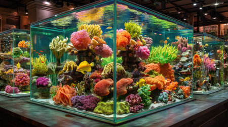 Explore a stunning coral reef aquarium filled with vibrant colors and diverse marine life, showcasing the beauty and complexity of underwater ecosystems.