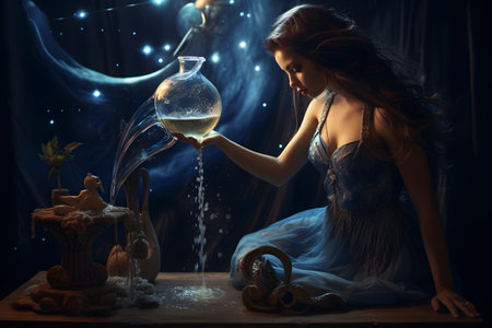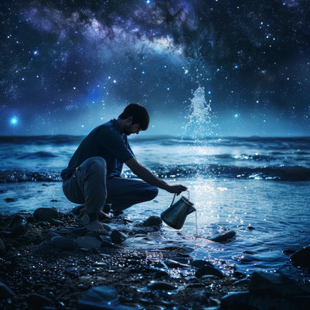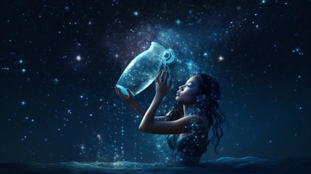 Aquarius Zodiac Sign, Horoscope Symbol, Magic Astrology Man Pouring Water from a Jug, Man Pouring Water in Fantastic Night Sky, Copy Space, Generative AI Illustration
