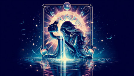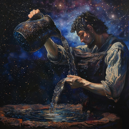 A luminous aquarius water bearer pours sparkling cosmic water onto a mystical barren landscape under a starry night sky.