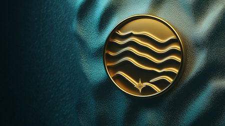 A gold coin with a star on it is on a blue surface. The coin is surrounded by water and sand