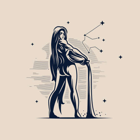 Sign of the zodiac Aquarius. Constellation of Aquarius. Woman with long hair with a jug of water. Vector illustration.