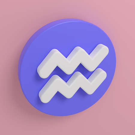 Three-dimensional icons of zodiac signs. The symbol of Aquarius. White zodiac sign on a blue cylinder on a pink background. 3D rendering.