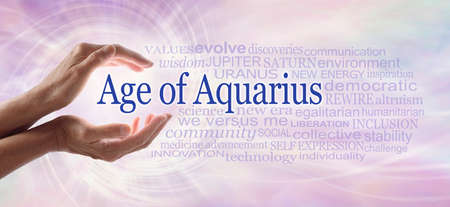 Words associated with the Age of Aquarius Word Cloud - female hands cupped around the words AGE OF AQUARIUS beside a word cloud relevant to the new era of Aquarius against a pink flowing vortex spiral