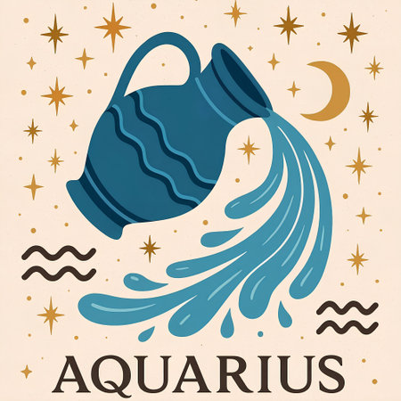 Creative digital illustration of astrological sign Aquarius. Eleventh of twelve signs in zodiac. Horoscope air element. Logo sign with water jug. Graphic design clip art for web, print. Add any text.