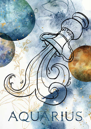 Watercolor poster of zodiak sign aquarius. Hand painted abstract card isolated on white background. Minimalistic gold linear illustration for design, print, fabric or background.