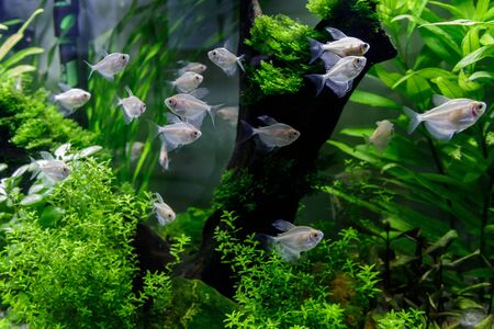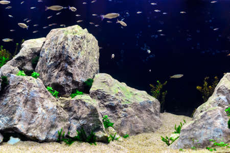 The view of freshwater aquarium with tropical fish and water plants