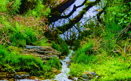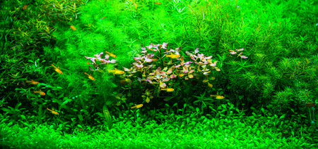 Underwater landscape nature style closeup aquarium tank with a variety of aquatic plants inside.Fresh water with hobby tropical fish