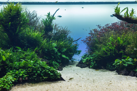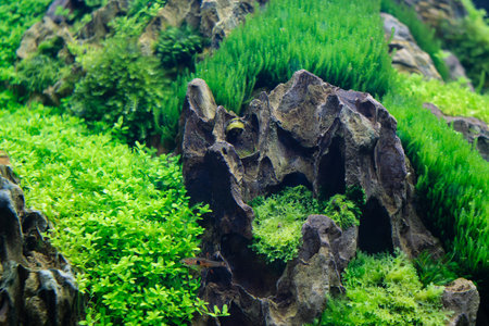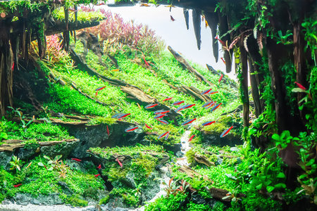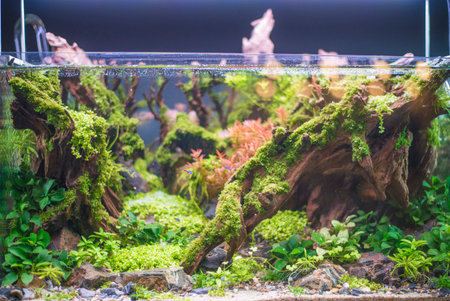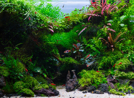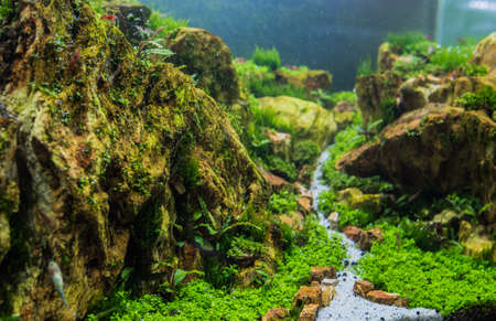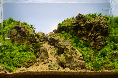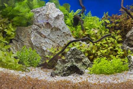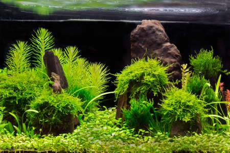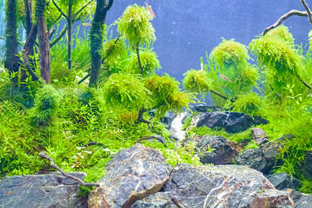 Underwater landscape nature forest style aquarium tank with a variety of aquatic plants, stones and herb decorations.