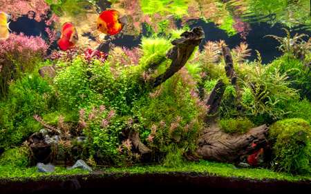 The view of freshwater aquarium with tropical fishes, discus symphysodon multi colored cichlids with aquatic plants