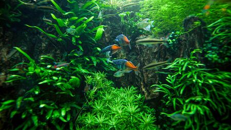 Planted aquarium with fish, tropical plant underwater for decoration