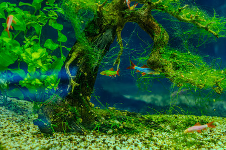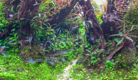 Beautiful Tropical Freshwater Aquarium with Green Plants and Fishes.
