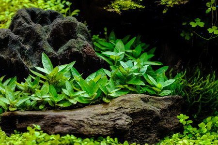 Underwater landscape nature style closeup aquarium tank with a variety of aquatic plants and driftwood inside.