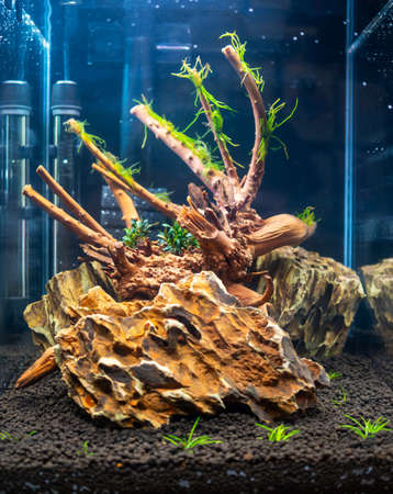 Launch of a new aquascaping with driftwood and dragonstone on soil with plants, freshwater aquarium for 30 liters