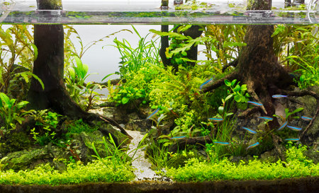 The freshwater fish tank is beautifully planted with green tropical plants.