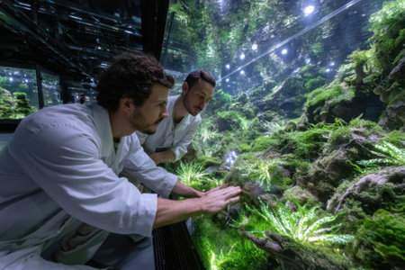 Two in researchers lab coats study an elaborate underwater environment filled with various plants.