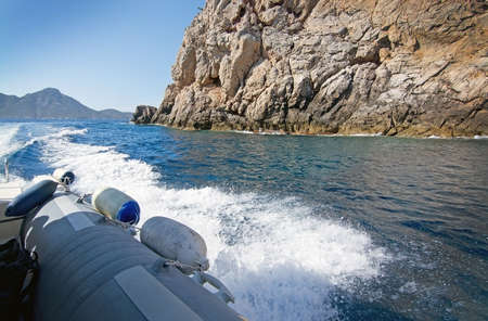 Mediterranean seascape and white boat foam with azure ocean water, horizon and rocky coast outside Sant Elm, Mallorca, Spain.