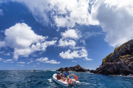 SANTA CRUZ DAS FLORES, PORTUGAL - AUGUST 9: Unidentified people relax on a small boat in the clear waters off Santa Cruz das Flores, Portugal on August 9, 2017.