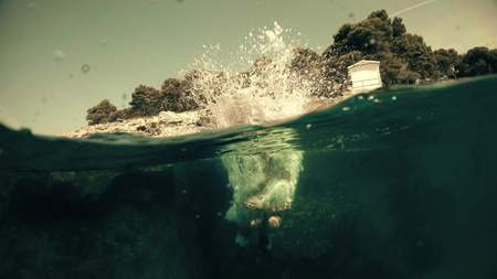 Jump to water, swimming on adriatic sea Makarska Korcula Croatia. Yacht in marina, sailing in Croatia.