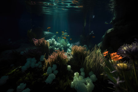 school of fish swimming in an underwater garden of bioluminescent plants and flowers, created with generative ai